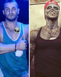 Contrairement à la majorité qui s’en tient à des tatouages ou des lentilles de contact, Anthony a franchi des limites. Il a subi des amputations, a retiré son nez, éliminé ses oreilles et divisé sa langue. Son corps, maintenant recouvert de tatouages noirs, fascine et choque à la fois.